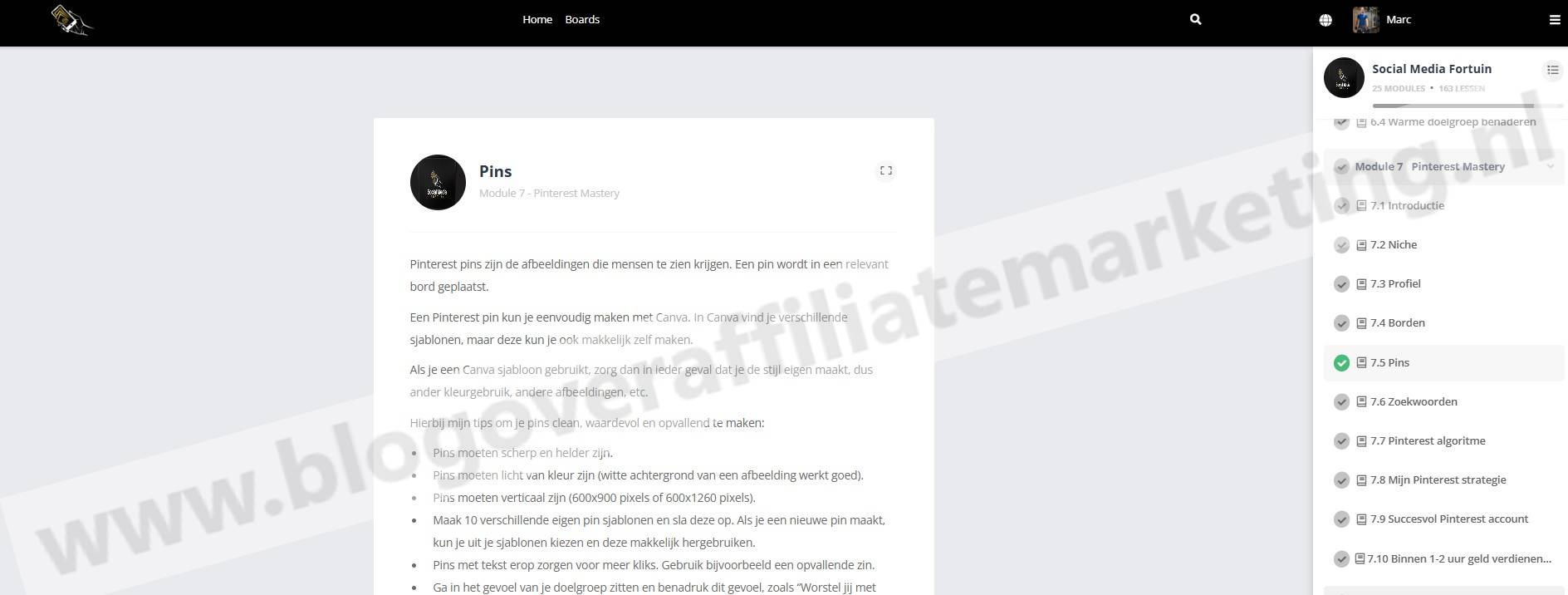 Pinterest Mastery is een belangrijk deel van Social Media Fortuin. Je leert hoe je Pinterest slim kunt gebruiken. De cursus geeft je handige stappenplannen. Je ontdekt slimme trucs om meer volgers te krijgen.